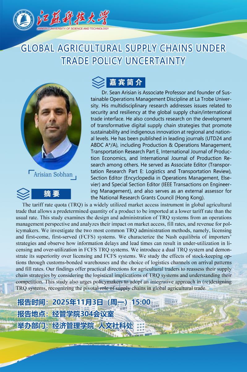 报告人简介:Dr. Sean Arisian is Associate Professor and founder of Sustainable Operations Management Discipline at La Trobe University. His multidisciplinary research addresses issues related to security and resiliency at the global supply chain/international trade interface. He also conducts research on the development of transformative digital supply chain strategies that promote sustainability and indigenous innovation at regional and national levels. He has been published in leading journals (UTD24 and ABDC A*/A), including Production & Operations Management, Transportation Research Part E, International Journal of Production Economics, and International Journal of Production Research among others. He served as Associate Editor (Transportation Research Part E: Logistics and Transportation Review), Section Editor (Encyclopedia in Operations Management, Elsevier) and Special Section Editor (IEEE Transactions on Engineering Management), and also serves as an external assessor for the National Research Grants Council (Hong Kong).