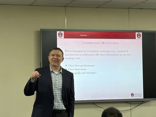 2025年10月21日,阿肯色大学山姆沃尔顿商学院Kristian D. Allee 教授应邀在江苏科技大学经济管理学院304会议室作题为《Disclosure Uniqueness and Analyst Participation: Evidence from Earnings Conference Calls》的专题报告。报告由经济管理学院会计系主任王秀萍副教授主持,经济管理学院青年教师与会计学硕士研究生参加。