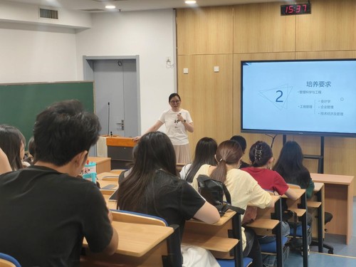 为帮助2025级研究生新生顺利开启学术生涯,9月18日下午,经济管理学院在图书馆B105举行研究生新生入学教育暨“院长第一课”。院长王念新、副院长叶涛锋、副院长金辉、学科办主任鞠可一、团委书记周庆文及各系主任出席了本次活动。活动由25级管理科学与工程专业新生汪燕妮主持。