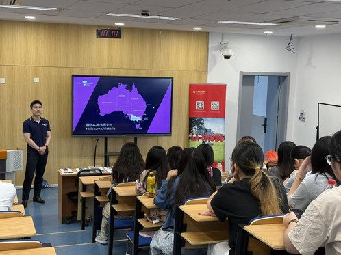 活动伊始,项目经理周潇致欢迎辞,简要介绍活动议程与目标。随后,Gabriel Sun经理以“墨尔本:机遇与协同”为主题,系统介绍了墨尔本的教育资源、城市活力及中澳合作潜力,为学生呈现了国际化发展的现实图景。