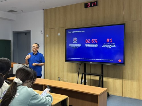 活动伊始,郑耀弋老师代表学院对Hefu Deng教授的到来表示热烈欢迎,并为同学们介绍了Hefu Deng教授的学术背景与研究领域。随后,Hefu Deng教授围绕RMIT大学整体概况、学科优势、课程设置、研究生就业等方面展开全面讲解。